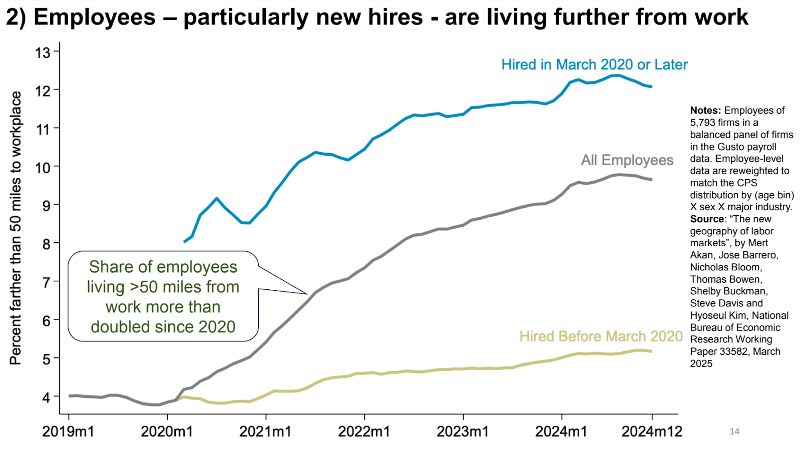 Gusto payroll data shows that employees, especially new hires, are living much farther from their workplaces than before. The share of workers living more than 50 miles from their office has more than doubled since 2020, with the biggest increases among employees in their 30s and 40s.