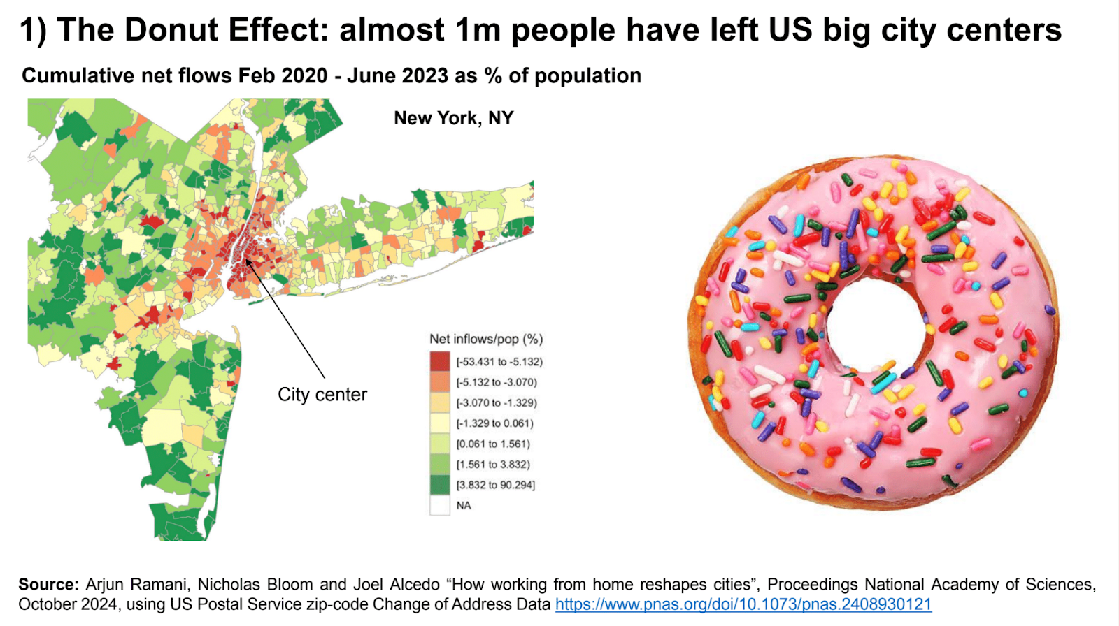 One of the most striking trends Bloom highlighted is the “donut effect”: nearly 1 million people have moved out of major U.S. city centers since 2020, creating a hole where dense weekday economic activity once existed. This has created significant challenges for transit systems and urban cores that still depend on pre-pandemic commuting patterns to stay financially resilient.