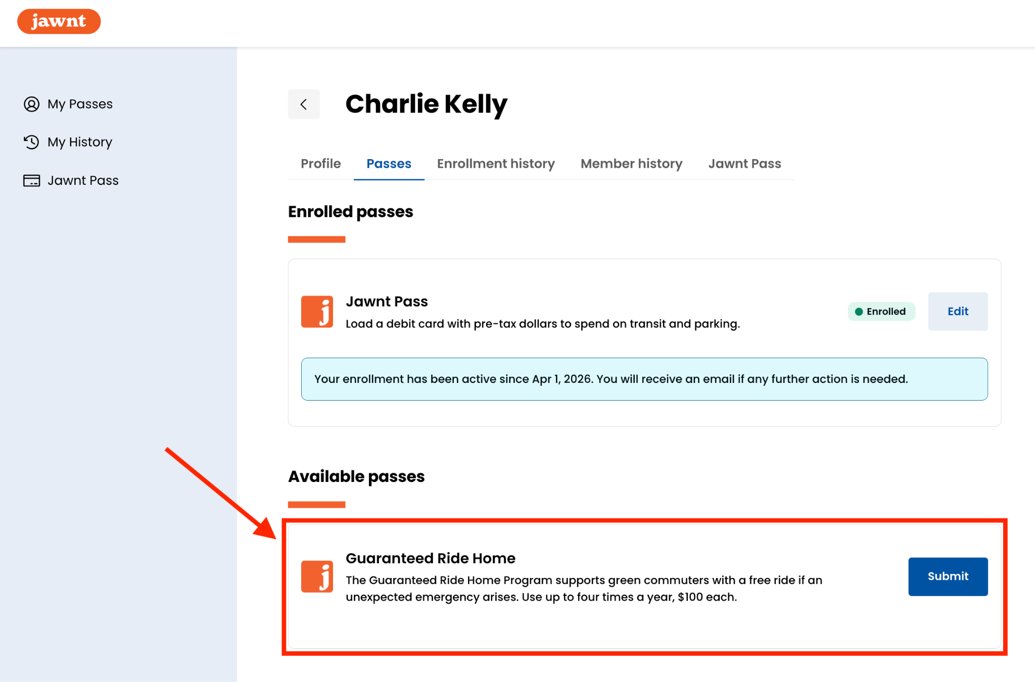 For organizations offering a Guaranteed Ride Home benefit through Jawnt, the entire experience lives right alongside the rest of your commuter benefits. Eligible employees will see their Guaranteed Ride Home benefit as soon as they log in to their Jawnt account.