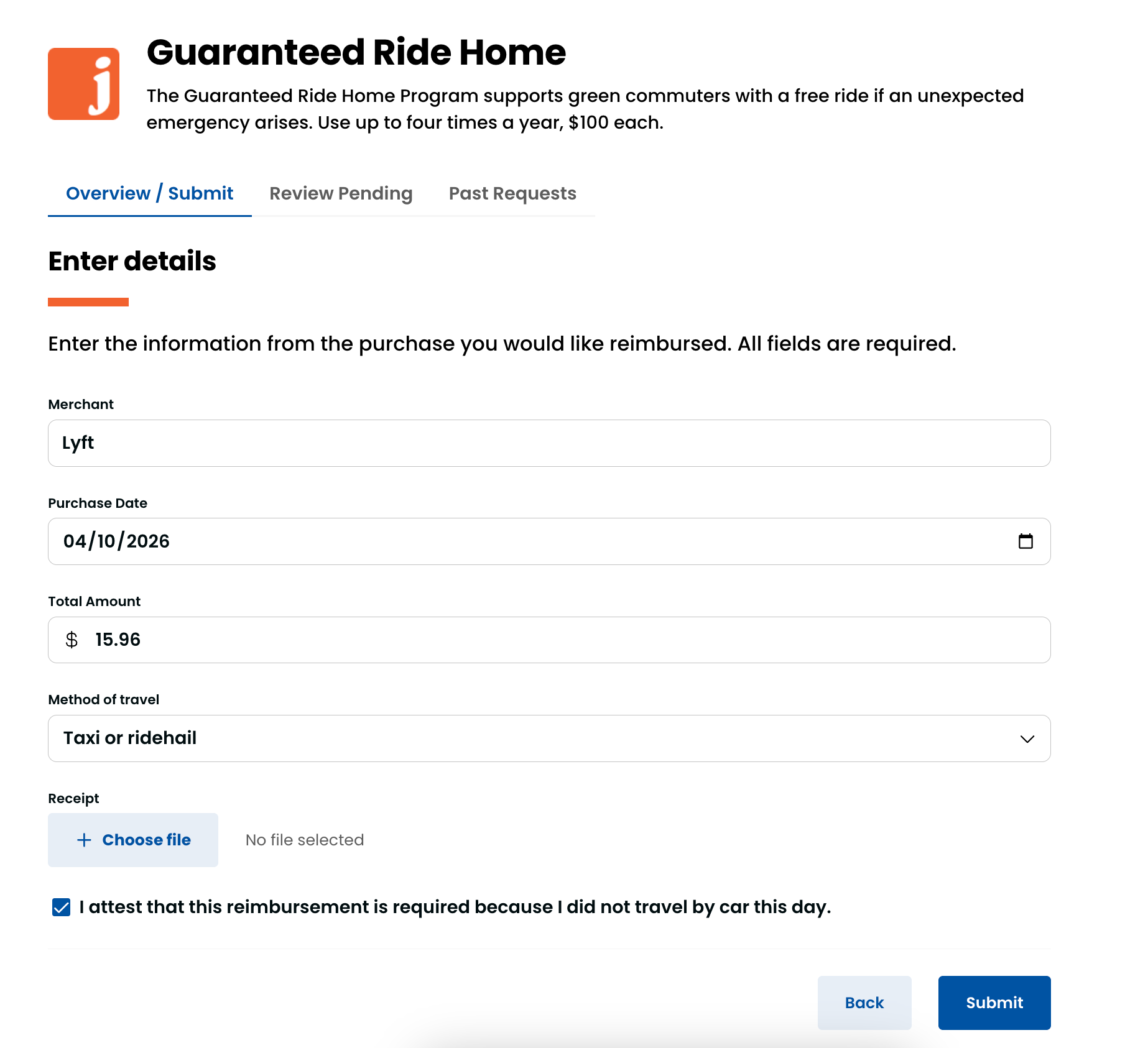 When submitting a Guaranteed Ride Home reimbursement request in Jawnt, the employee enters the details of their ride home (merchant, date, amount, and method of travel) and uploads their receipt, allowing for quick and streamlined processing.
